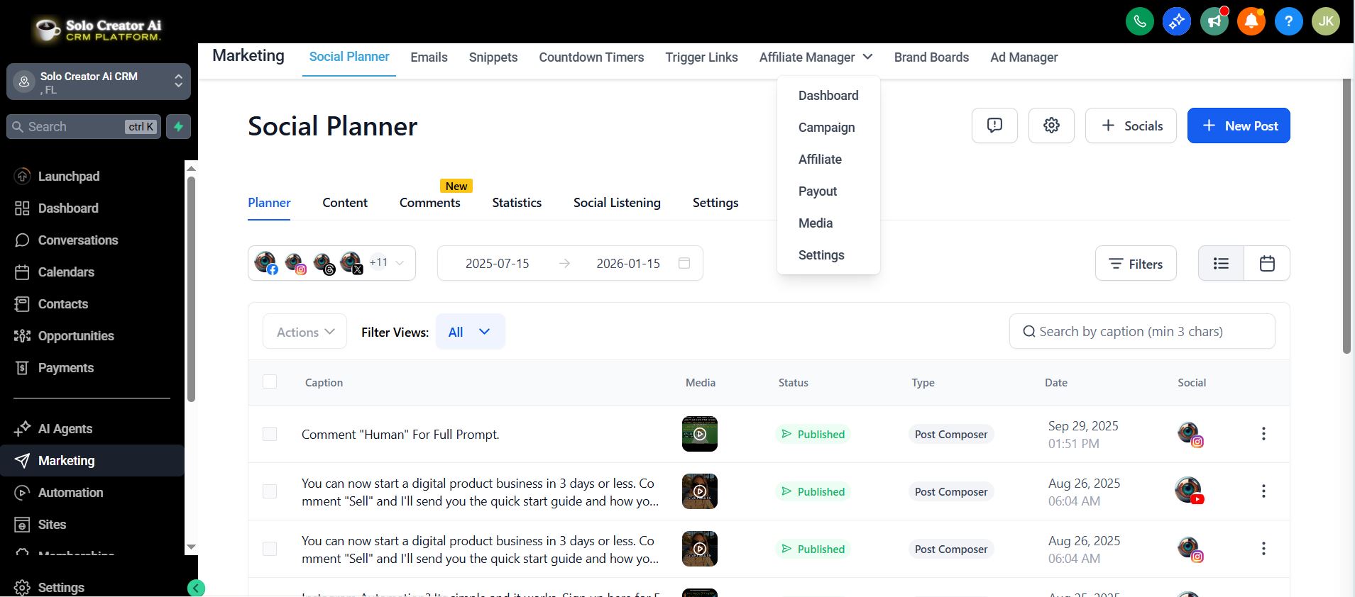 From one dashboard you can post across platforms, track every DM and comment, and trigger unlimited Instagram comment and DM automations that send people straight to your offers, freebies, and links.